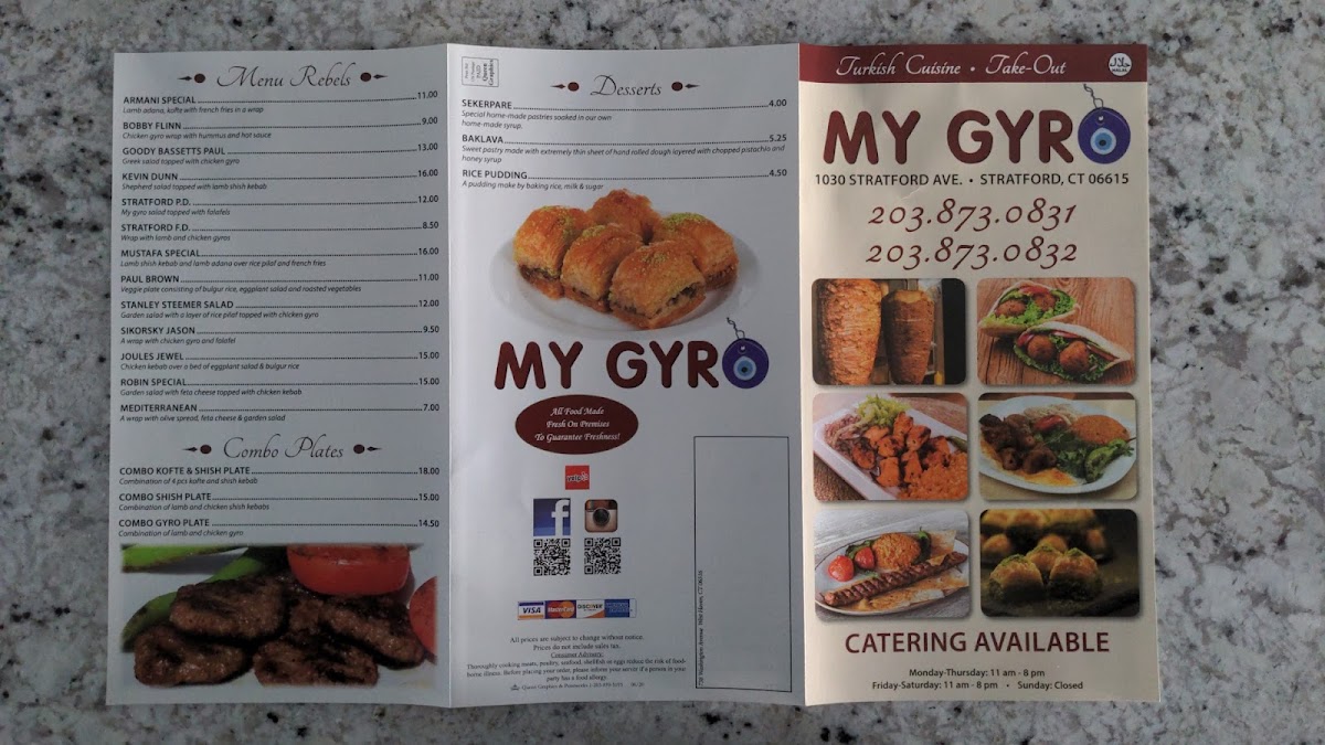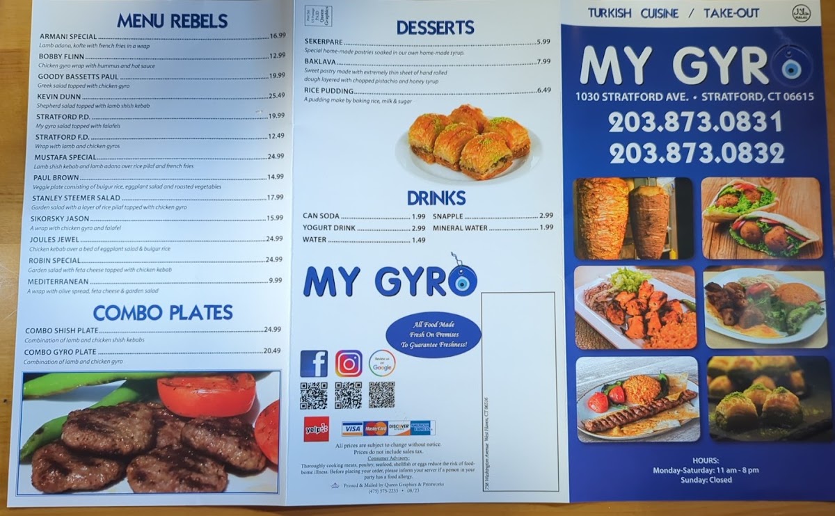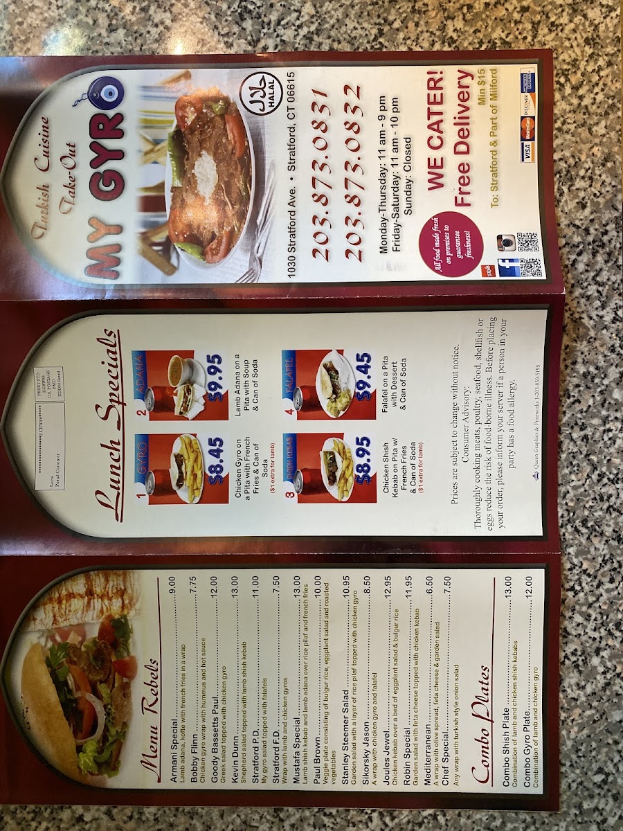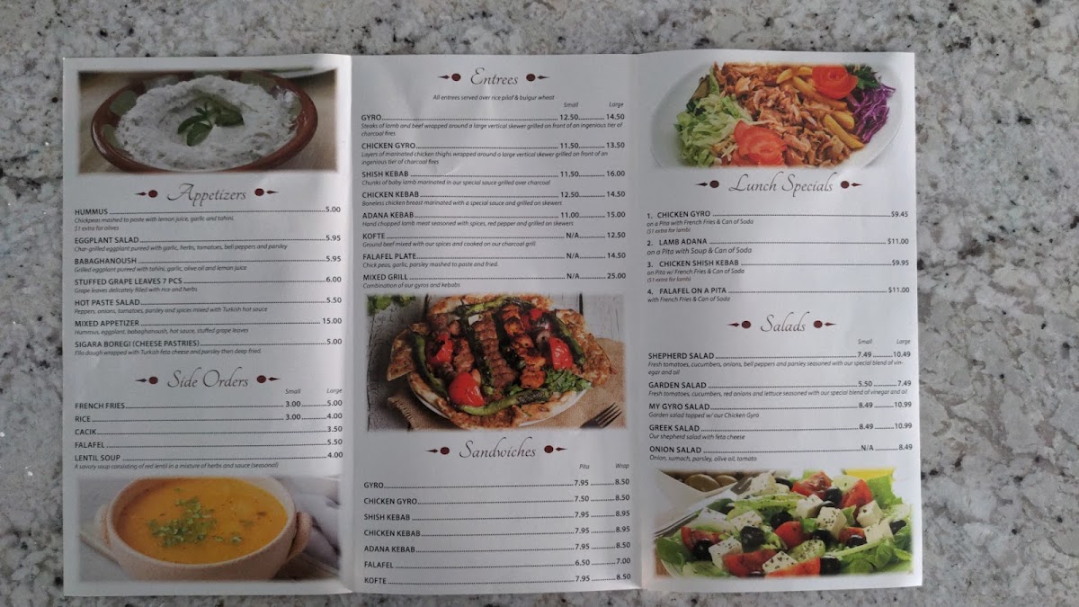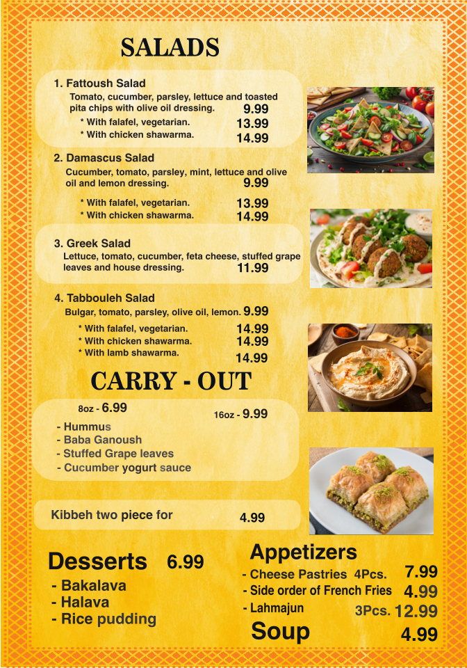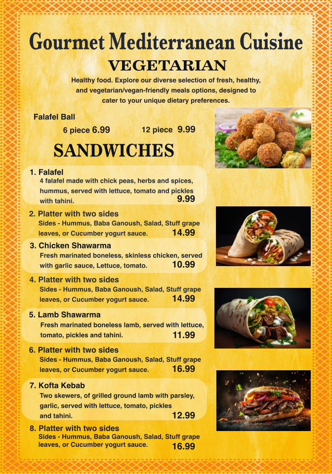 Two sides of your choice, Rice (Spicy, Regular, Mujadara or Bulgar), Stiffed grape Leaves, Hummus, Salad, Eggplant salad, or Cucumber Yogurt Sauce.